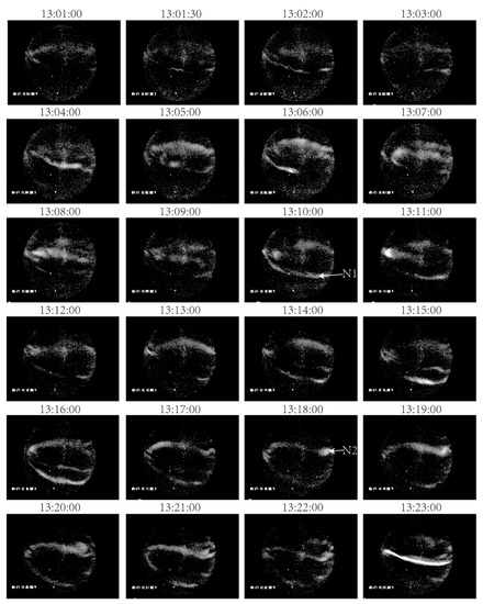 The auroral images in Figure 4 and Figure 5 show remarkable and captivating evolutions. Between ~1304 UT and ~1322 UT, the first equatorward moving auroral arc (N1) began to form in the lower-latitude area and moved equatorward with increasing luminosity. At ~1318 UT, another auroral arc (N2) started moving equatorward and arrived at equatorward boundary at ~1331 UT. Meanwhile, an area of significant luminosity enhancement was observed at high latitudes between ~1325 UT and ~1332 UT. After the disappearance of arc N2, several poleward moving auroral arcs were detected. At ~1333 UT, an east-west elongated auroral arc (N3) began to form at low latitudes and moved poleward. At ~1335 UT, the second east-west elongated poleward moving auroral arc (N4) began to form and coexisted with the former auroral arc before both arcs fade out around 1340 UT. At ~1336 UT, another auroral arc (N5) appeared at low latitudes, although its luminosity was lower than the former arc.