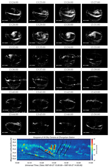 Auroral observations obtained from all-sky imager in Zhongshan station, the upper images indicate the time sequence of the auroral images same as Figure 4. The bottom row represents the keogram of auroral arcs as a function of time and latitude between 1300 UT and 1400 UT.
