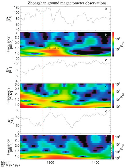 Three components of geomagnetic field observed at Zhongshan magnetometer, utilizing a non-stationary filtering technique (a,c,e). Wavelet power spectra of three components of magnetic field are presented in (b,d,f) column, in which the solid black line is the frequency with maximum power.