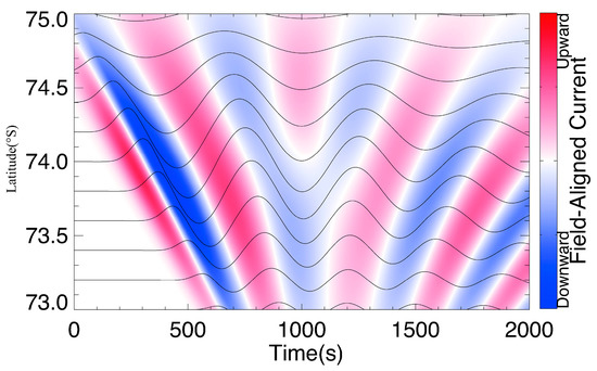 in which the x represents poleward direction, the azimuthal y directs westward direction, and the z points vertically upward direction. (x) represents the local field line eigenfrequency which varies with latitude, G(t,x) controls the spatial and temporal extents of the waves, and controls the phases of the waves. By setting G(t,x) and as proper functions, we could control the propagation direction and velocity of the fast mode driver. We would like to emphasize that, as discussed in [11], when (x) is set as a constant, as in the standard FLR theory, the phase shift across latitudes remains unchanged over time, resulting in constant propagation speeds for auroral arcs. However, a solar wind pressure pulse can trigger earthward compressional pulsations, typically characterized by a broad spectrum, and globally excite narrow-band FLRs at different frequencies that match the local field line eigenfrequency [37,38]. In the present case, we adopt the second assumption, as the propagation speed of auroral arcs varies with time. The FACs induced by FLR can be obtained through Ampere’s law: