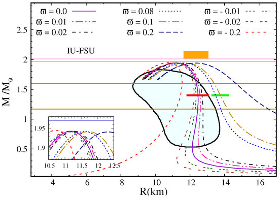 Let us discuss and compare our results with recent astrophysical observations and nuclear physics experiments. At first, the NS in low-mass X-ray binary (LMXB) NGC 6397, depicted as a green shaded area in all figures, provides a constraint at 68% confidence level over the possible values of the masses and corresponding radii of the NS [45,46]. Similarly, the millisecond pulsars are among the most useful astrophysical objects in the Universe for testing fundamental physics, because they impose some of the most stringent constraints on high-density nuclear physics in the stellar interior [47]. Recent measurements coming from the Neutron Star Interior Composition Explorer (NICER) mission reported pulsar observations for canonical ( M) and massive ( M) NS. The mass measurement and radius estimates provided for these objects, are 11.80 km 13.1 km for the 1.4 M NS PSR J0030+0451 (horizontal line segment in red color shown in all Figures) and 11.60 km 13.1 km for a NS with mass between 2.01 M M ≤ 2.15 M PSR J0740+6620 (the rectangular region in orange color shown in all figures). However, the authors of Ref. [48] used the recent measurement of neutron skin on Pb by PREX-2 to constrain the radius of NS, which leads to a prediction of the radius of the canonical 1.4 M of 13.25 km 14.26 km (horizontal line segment in green color shown in all figures). Likewise, we also compare our results with two massive stars that had been discovered in 2010 and 2013, namely, PSR J1614+2230 [49] with mass M (horizontal line in blue color shown in all figures) and PSR J0348+0432 [50] with mass M (horizontal line in pink color shown in all figures). Our results are discussed in the next paragraphs.