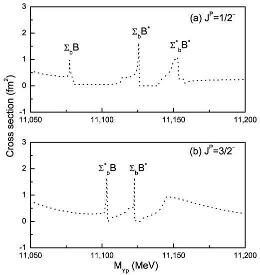 Because of the heavy flavor symmetry, we also extend the study to the hidden-bottom pentaquarks. The results are similar to the hidden-charm molecular pentaquarks. Figure 2 shows the cross-sections of the channel with and , respectively. From Figure 2a, we can see three sharp peaks in the cross-sections, which correspond to three resonance states, i.e., , , and , with . The resonance mass of the state is 11,077.5 MeV and the decay width is about MeV; has a mass of 11,125.8 MeV and a decay width of MeV; and has a mass of 11,153.5 MeV and a decay width of MeV.