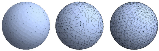 Homogeneous discrete space with positive curvature. Left: a simplicial 0-complex (a non-triangulated, completely disconnected space). Middle: a simplicial 2-complex (a partially triangulated space). Right: a homogeneous simplicial 2-complex (a triangulated space).