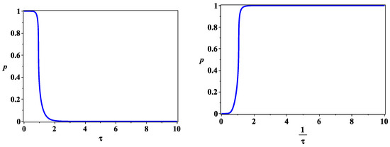 For illustrative purposes, we chose the dependence of the chemical potential on the temperature to be . The typical behavior of the connection probability is shown in Figure 3. The graph is depicted for the choice of parameters: , and , where is the Planck temperature. One can see that the system experiences a phase transition at the critical temperature forming the fermionic condensate with the maximally entangled states. This transition is quick, and the Universe becomes a wholly triangulated space at the temperature ∼, where ∼ is the temperature of the grand unification epoch beginning.