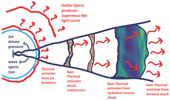 Figure 1 also shows emission from the off-jet axis ejecta. The jet sends a pressure wave through the star and this alone has been shown to be able to eject the stellar material [25], but the accretion disk is also likely to blow a strong wind that contributes to the ejection of the stellar material. This mass ejection both powers a supernova-like light curve and, ultimately, limits the accretion, cutting off the engine. Note that a supernova is not required to produce this emission, just the ejection of the stellar material and the pressure wave produced by the jet is sufficient to achieve this.