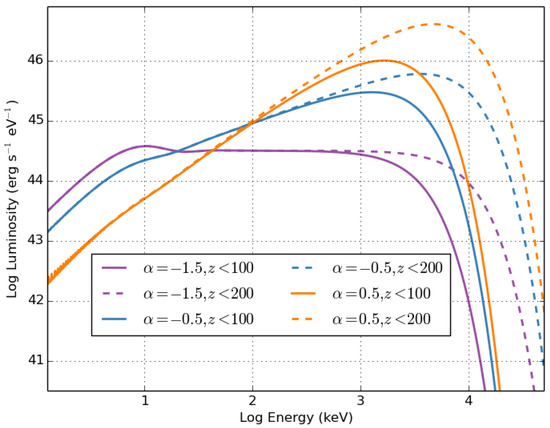 Another model that received very little attention was the role of thermal emission in gamma-ray bursts. As we have learned with neutron star (NS) mergers, the emission arises from a range of sources including thermal (powered by shock heating, radioactive decay, and possibly additional engines such as magnetars) and nonthermal (both from the jet as discussed above and the remnant) emission. Initially, the GRB community ignored studies suggesting that the emission (or parts of the emission) could be powered by thermal emission [18,19,20]. In part, because the theory behind the thermal emission is much better understood than the nonthermal emission, it is a powerful probe of the properties of the GRB ejecta. For example, Figure 2 shows the spectra from this ejecta, assuming a distribution of Lorentz factors where the area (as a function of Lorentz factor) of the thermal emission is . Here, we assume that the minimal Lorentz factor is 1 and the maximum Lorentz factor is either 100 or 200 (for more details, see Lesage et al. in preparation). By studying the emission spectra, we can constrain the structure of the GRB jet at a level that has not been carried out to date, but this requires disentangling the thermal and nonthermal components. This work was delayed until scientists rediscovered the concept of a thermal component that produces the gamma-ray signal [21,22]. It is now applied to many of the new GRB observations, e.g., [23,24].