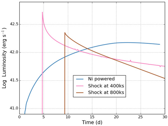 Luminosity for 3 SN explosions with the same Wolf–Rayet progenitor and explosion energy, but one is powered solely by the decay of radioactive nickel ( of 56Ni) and the other two are powered by shock heating, where the shock heating model relies on a single shock decelerating the ejecta and converting kinetic energy into thermal energy that drives the emission. The shock heating models differ by having different timescales for the shock deceleration (400 and 800 ks). For more details, see Fryer et al. in preparation.
