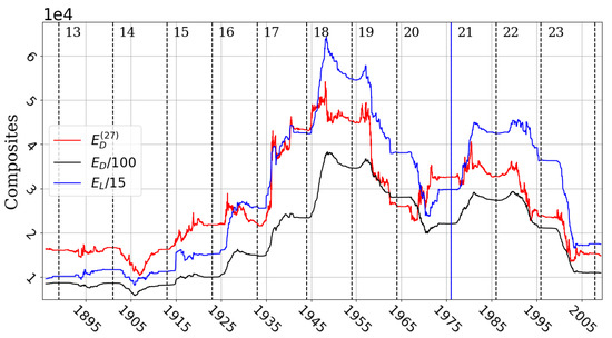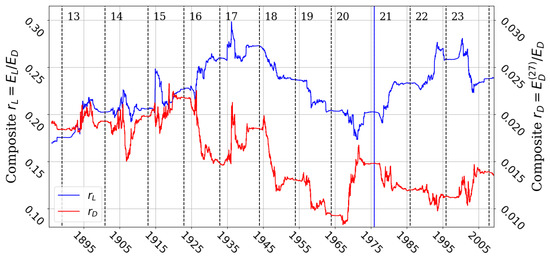 The daily and ratios computed with the sunspot and sunspot group indices, and , represent the dynamics of the axial asymmetry exhibited by the solar magnetic field. Indeed, these quantities are affected by magnetic fluxes appearing at specific locations for few ∼27-day solar rotations (as our Fourier transform-based computation measures the presence of objects which appear and disappear once per 27 days). We note that the composite found with the areas of ReLaSS also describes the axial asymmetry of the solar magnetic field. According to Figure 1, the composites , , and have much in common, including a general two-peak pattern and the fall at the 20th cycle. Yet, with this scale of observations, a stronger high-frequency component is seen in the dynamics of the total energy (red curve).