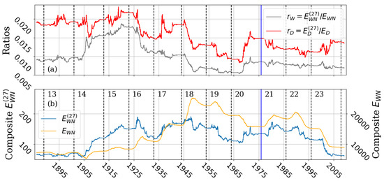 and computed within the same sliding windows. The contribution of the 27-day component is estimated with the ratio of the packet of waves to the whole energy: