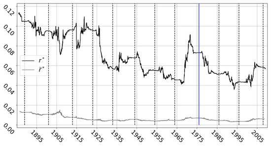 The contribution of the 27-day component to solar activity until the end of the 1970s was first exposed in paper [37]; see their Figure 8 and our Figure 2a,b. The authors found a growth of the 27-day component 1–2 solar cycle prior to a general rise of solar activity. Extending their graph with the modern data, we observe a slow steady decay of during the last 3 cycles, which indicates a gradually decreasing role of the 27-day component (gray curve in Figure 2a). On the one hand, the level of the ratio attained during cycles 21–23 is just slightly below that observed in 1885–1905. This feature agrees with the existence of 70–100-year oscillations of the solar activity called the Gleissberg cycle. On the other hand, both ratios and at the right points of Figure 2a are lower than at the left points, which may be related to regularities at the scales that are (significantly?) longer than the Gleissberg cycle.