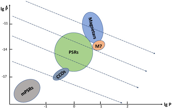 Low fields together with small spin periods correspond to old “recycled” mPSRs originating from LMXBs. In this section, we do not discuss them, focusing on young “normal” PSRs (in many respects, a group of so-called rotating radio transients (RRATs; see [13]) can be unified with PSRs, as they share main properties).