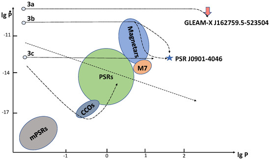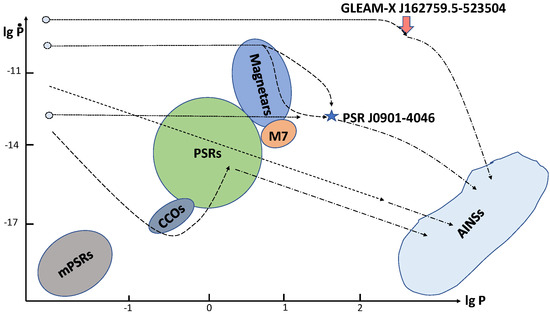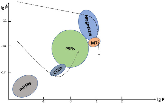 P– diagram. The main types of young isolated NSs are shown together with recycled mPSRs (lower left part of the plot) and the simplest tracks corresponding to Equation (1) with a constant magnetic field. Scales on axes are approximate.