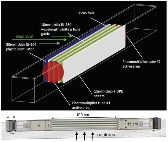 Upper panel: A single detector module rendered in Geant4, with individual components labelled. White sheets: HDPE. Green: wavelength shifting light guides. Yellow: Li:ZnS foil. Blue: EJ-204 plastic scintillator. Red: Photomultiplier tube face. Lower panel: The CAD rendering of a single detector module.