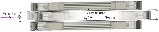 The arrangement of four ATTIKUS detector modules around the gas target vessel and ion beam. The set-up is shown specifically for measuring the 13C(α,n) cross section. As the 13C ion beam passes through the 4He gas, it loses energy. The interaction point (emission position of the neutron) dictates the centre-of-mass energy of the nuclear reaction. The centre-of-mass energy resolution of the detector is therefore limited by the position reconstruction position of the neutron.