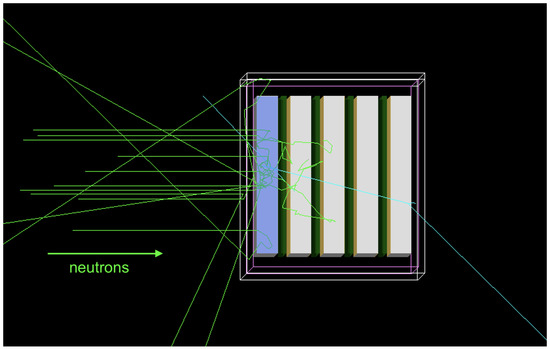 These initial, basic simulations work on truth-level Monte-Carlo. The chosen energy distribution of neutrons is directed into the detector perpendicularly as shown in Figure 3. This figure shows the paths of neutrons entering the detector and their paths inside the detector. Some scatter inside the detector and escape, some (not shown) pass directly through the detector without interacting, and others do interact and are captured inside the detector. Two classes of events were considered. Firstly, those that moderate and stop somewhere in the detector. Secondly, coincidence events that interact in the plastic scintillator (blue) then later go on to be captured in another detector layer (necessary for neutron/gamma discrimination).