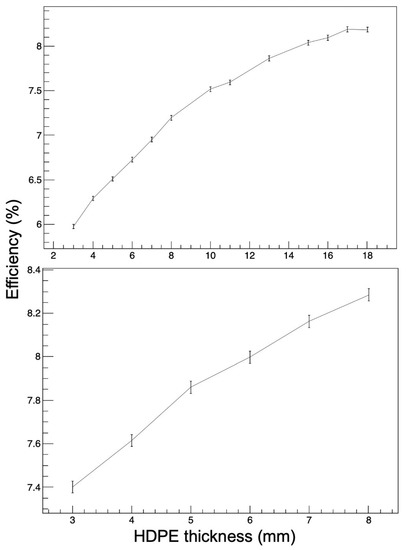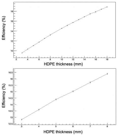 Efficiency for neutron capture inside the detector as a function of HPDE thickness, for WLS thicknesses of: upper panel, 10 mm and lower panel, 20 mm. Neutrons were simulated from a flat distribution between 2–4 MeV.
