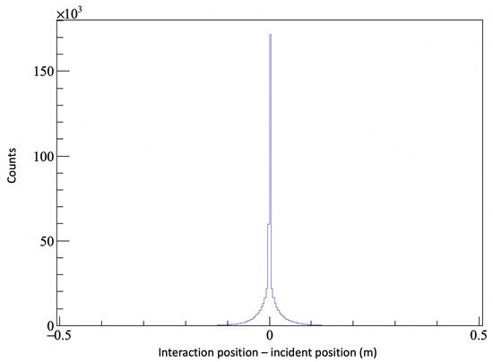 The difference between the incidence and hit position of the incident 2–4 MeV neutrons in the plastic scintillator layer. Neutrons were simulated from a flat distribution between 2–4 MeV.