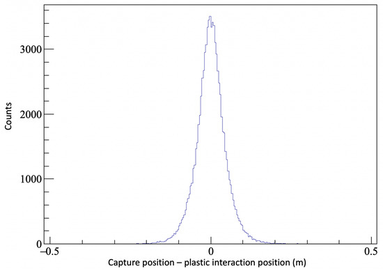 It can also be noted that for neutrons incident perpendicularly on the detector, that the fast neutron interaction point in the plastic scintillator and the point of capture of the moderated neutron are correlated. Figure 8 shows a histogram of the difference between these two interaction positions, as measured along the length of the detector. This correlation could, in principle, be used to coarsely determine the angle of neutrons as they enter the detector.