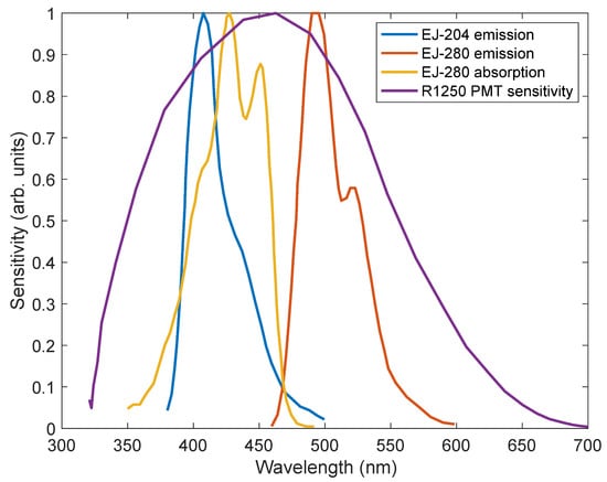 In Geant4/CRESTA, optical and scintillation properties of materials can be included in the simulation. This allows scintillation photons to be generated due to the interaction of charged particles in scintillating media. Relevant parameters for the simulation include: scintillation efficiency (photons per 1 MeV electron); emission spectrum; light attenuation length; rise time and decay time; refractive index; reflectivity and absorption properties at all material boundaries. For the light detecting medium (PMT), the spectral response function is required. The absorption and emission spectra of the EJ-204 (plastic scintillator) and EJ-280 (WLS), along with the sensitivity of the Hamamatsu R1250 PMT is shown in Figure 9.