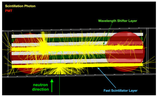 Once this has been included, the paths of individual photons can be tracked through the detector towards the PMTs. Graphical visualisation of this process is difficult because it is computationally intensive due to the number of optical photons. Nonetheless, the optical simulation of a single coincidence neutron detection is shown in Figure 10.