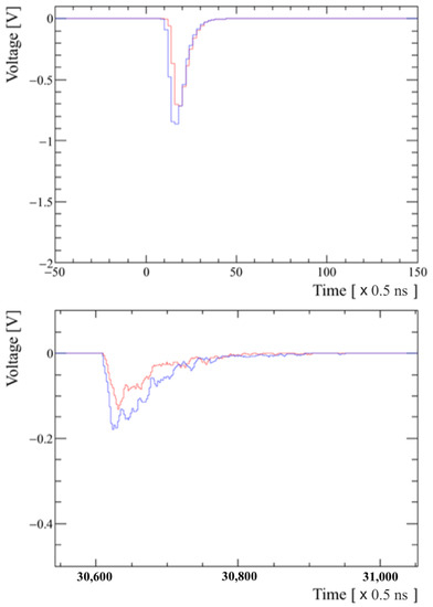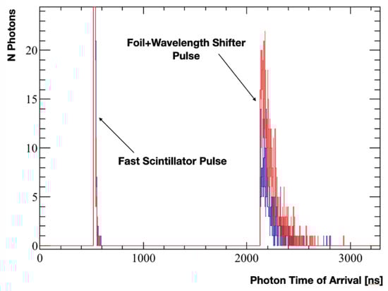 Pulses calculated based on the number of photons entering the PMTs as a function of time for a 3 MeV incident neutron. The pulses from each PMT are shown in blue and red, respectively.