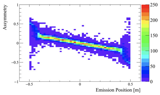 where and are the integrals of the fast neutron pulses measured at each end of the detector. The pulse height asymmetry, and incidence position are plotted together as a 2D heat map in Figure 14, which demonstrates a clear correlation.