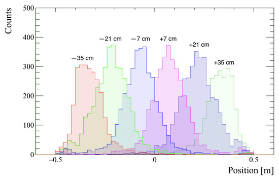 One dimensional slices of Figure 14 are shown in Figure 15 and Gaussian fits to these distributions demonstrate a typical position resolution of σ = 10 cm for the 2–4 MeV neutrons. This is close to the design goal. It is expected that the position reconstruction resolution will vary with incident neutron energy. One of the limiting factors in position resolution is the integral of the pulses measured in the PMTs at each end of the detector, which is dictated by photon counting statistics. Higher energy neutrons will result in larger signals in the plastic scintillator, resulting in more scintillation photons, meaning that the fractional uncertainty on the interaction position will reduce approximately as . This characteristic will be explored in future work.