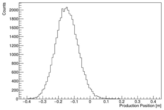 The neutron track in Figure 3 indicates that the neutrons can undertake significant “walk” inside the detector before being captured. This worsens the resolution with which the position of incidence can be determined, which is crucial for determining the centre-of-mass energy of the reaction being measured in TTIK. To explore the extent of this effect, a uniform flux of 2–4 MeV neutrons was simulated to enter perpendicularly into the efficiency-optimised detector, along its whole 1-metre length, and the eventual capture position of the neutron was compared with its incidence position along the beam direction. The difference between these two quantities is plotted as a histogram in Figure 6.