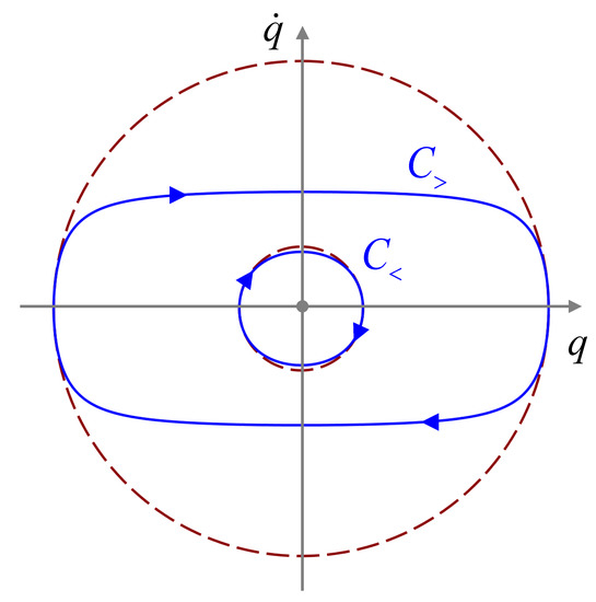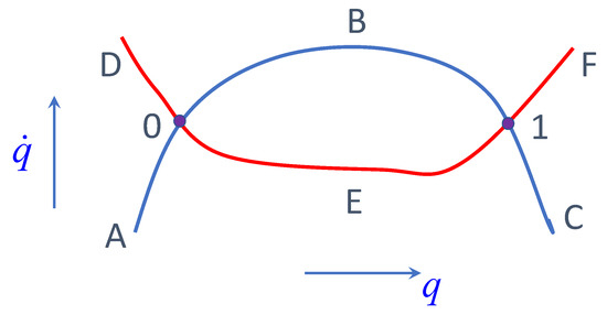 Figure 1 illustrates a motion of a system with the inequality constraint. It shows curves of constant energy E and of the constraint on the phase plane. Let be curve (E-curve) and be a constraint curve . Point 0 and 1 where these curves intersect are transition points between the sub- and supercritical regimes. Suppose that is positive above the curve . Then, the system moving from A after reaching the transition point 0 moves along supercritical trajectory . After the second transition point 1 it continues its motion along a subcritical trajectory . Since the velocity on is less than the velocity on for the same value of q, the time of “travel” between 0 and 1