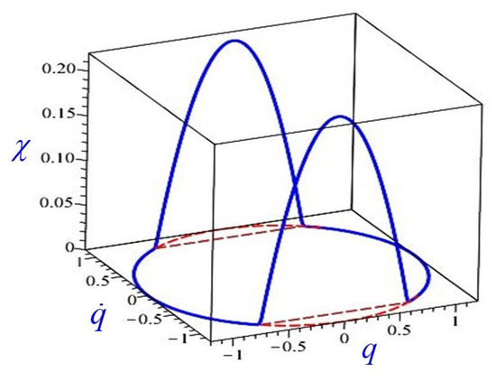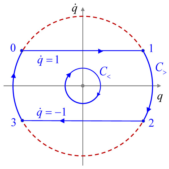 where index 1 indicates that a corresponding quantity is calculated at point 1. Since, at this point, , the control function should decrease and become negative. This is impossible because . This means that further motion along the constraint beyond point 1 is impossible and the oscillator moves from point 1 to point 2 along the subcritical trajectory, shown in Figure 2. A similar analysis, repeated for the other critical points, shows that this figure accurately represents the motion of the oscillator for the action (36).