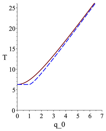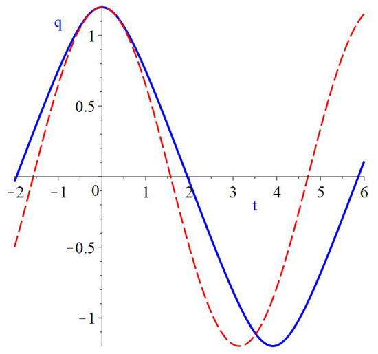 By integrating the first-order differential Equation (46), one can find a position of the oscillator at time t, . To illustrate its behavior, we show in Figure 6 function for (a solid blue line). For comparison, this figure also shows the function for a similar non-relativistic oscillator with the same amplitude (a dashed red line).