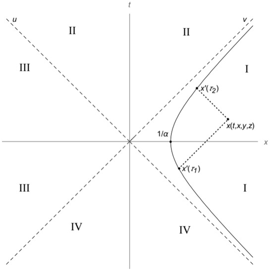 Moreover, being a quadratic system, we expect to obtain two possible solutions, and , for a given . One of them is interpreted as the one in which lies in the past light cone of () and, therefore, any light signal emitted in would not affect the field measured in . The other solution describes the reverse situation: here lies in the future light cone of (). We must choose the latter, since it is the one that satisfies the second causality condition (). Still looking at Figure 1, we see that in region II and region IV there can only be one possible solution for each x. Moreover, in region IV the solution does not satisfy the second causality condition, so the field will be equal to zero also in that region. Therefore, at this point we can already say that the field we are going to obtain will have a nonzero value only in regions I and II, that is, for . Later we will discuss what happens at the boundary between regions I and IV and between II and III ().