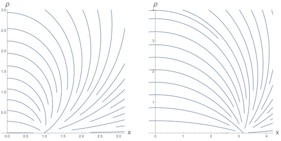 If we analyse Figure 1, we can obtain valuable information about the field we are looking for, even before we try to solve this system of equations. Since the particle’s trajectory is confined to the region defined by (region I in Figure 1), this system of equations is only solvable for x in regions I, II, and IV, so we conclude that the field vanishes in region III ().