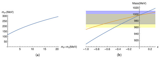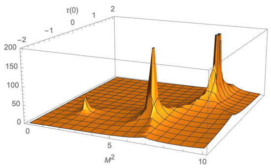 Here, we show a numerical method to the solution of the mixed equations, Equations (31) and (32). The diagonal basis is known and the solutions in each of the u and d sectors are . Here, with fixed , we vary the mass squared and the value of . We plot the quantity , which diverges when both the fields vanish asymptotically. In this case, we have set one quark mass to unity and the other to 0.5 there are clear peaks at and , which are the zeroth and first excited states of the d quark state. The peak at and is the ground state of the u quark.