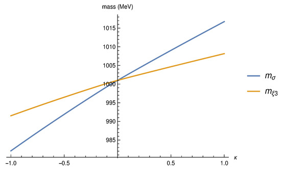 Finally, we must consider the off-diagonal complex fluctuations of X. These two real scalars acquire a mass squared from the potential Equation (19) also proportional to . Their equation of motion is again degenerate with the scalars already discussed, as well as the vector mesons in Equation (37). These are the same equations of motion as were numerically studied in [43], so we do not explore the numerical solutions further here.