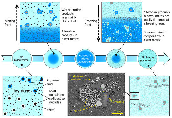 Aqueous fluid-related processes in an icy planetesimal deduced from the Ryugu particles. (Bottom left) In a planetesimal composed of icy dust, the heat generated by the decay of radionuclides causes a phase transition of the ice around the dust. The ice sublimates under extremely low-pressure conditions near the surface, but under lithostatic pressure in the interior, it transforms into liquid water. (Top left) Silicate components with organic matter in the dust are converted into hydrous silicate minerals by reactions with aqueous fluid. The aqueous alteration proceeds from the inside of the planetesimal toward the surface, and the volume of the wet matrix with alteration products increases. (Top right) As the decay of radionuclides is terminated, the aqueously altered planetesimal begins to freeze from the surface. Due to the difference in freezing point and reaction rate related to the diversity in chemical composition of the aqueous fluid, a transition zone consisting of solid-liquid composites develops near the boundary between the wet and the icy matrices and migrates toward the interior, where coarse-grained components are grown through freezing-thawing cycles. The alteration products, loosely distributed in the wet matrix, are pressed by the re-frozen icy matrix that grows inward due to the volume change accompanying freezing, and are locally flattened at the freezing front (e.g., Figure 6a in [19]). (Bottom right) During the planetesimal re-freezing, the droplets of aqueous fluid that are dispersed between large quantities of minerals and organic matter components, repeatedly freeze and thaw in isolation from the earlier frozen matrix. Finally, they become coarse-grained components such as the carbonate nodule, accompanied with magnetites with different crystal habits and sizes, found in the Ryugu particle (A0048-3, inset).