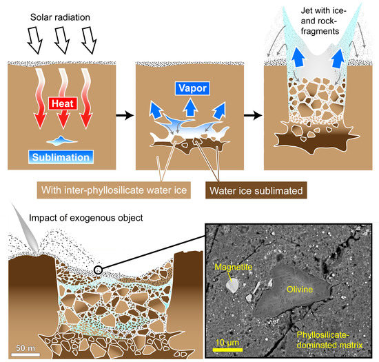 The dynamical evolution of the cometary nucleus-like body that would become the rubble-pile asteroid Ryugu. (Top) As a cometary nucleus-like body moves towards the inner solar system, solar radiation causes subsurface ices to sublimate, forming cavities. Subsequent sublimation and water vapor pressure propagate the fissures and enlarge the cavities, eventually causing the ceiling to collapse. The collapse forms a pit resembling a sinkhole and exposes fresh materials in the walls of the pit, which sublimate to produce water vapor jets, accompanied by subsurface materials. Parts of the debris are redeposited on the surface, and are sintered together with surface materials by refreezing the water vapor in place. (Bottom) During the repeated sublimation and resurfacing, the debris deposits above the subsurface materials collapsed into the pit, along with the surface materials containing fragments from exogenous objects around the pits, formed a conformable stratum, and intermingled with the materials with and without inter-phyllosilicate water ice. As such, the surface of a cometary nucleus-like body was modified locally, resulting in the formation of a rubble pile structure, and the implantation of the exogenous materials such as the unaltered olivine grain (A0073-5, inset) and the massive domain accompanying the foliated matrix (Figure 1e in [19]).