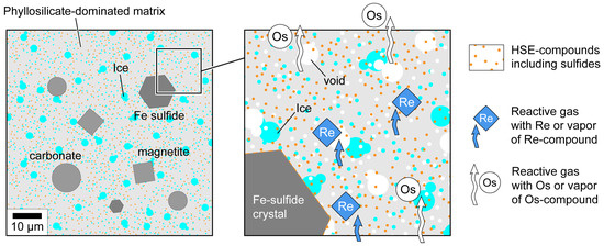 For the timing of the sublimation, the systematics of highly siderophile elements (HSEs) and the non-isochronous Re-Os isotopes of Ryugu particles [19] may provide evidence that it was a geologically recent (≪1 Ga) event (see Figure A1 for details). Upon sublimation, the jets of water-rich vapors, which contain highly reactive gas components (e.g., HS, HCl, and HF) [20,60], could have reacted with the sub-m-sized HSE-bearing compounds such as Fe sulfide in the matrix, resulting in a selective sublimation of more volatile Os-bearing molecules (Figure 3). If this is the case, the non-isochronous behavior of the Re-Os isotopes found in carbonaceous chondrites [61] may have resulted from sublimation on their icy progenitor bodies.