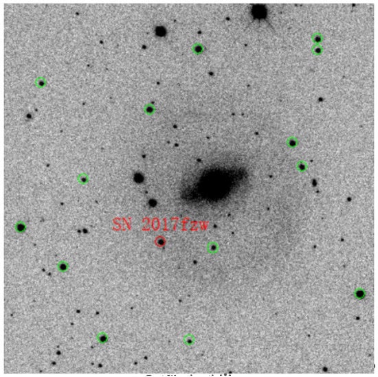 SN 2017fzw (red circle) and a local sequence of standard stars (green circles) in the field of NGC 2217 (i-band image, obtained by LCO on 7 September 2017 UT).