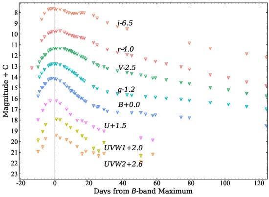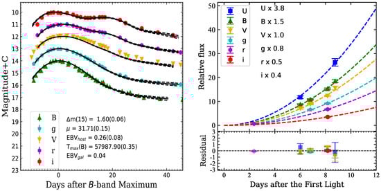Figure 2 shows the UV/optical light curves of SN 2017fzw. These light curves have a nearly daily cadence from about −10 to +125 days relative to B-band maximum light. Like normal SNe Ia, the r/i-band light curves of SN 2017fzw clearly show a shoulder/secondary maximum, and its light curve peak reached slightly earlier in i-band relative to B-band. These multi-band light curves were fit by SuperNovae in the object oriented Python code SNooPy2 [,] to determine the time of B-band maximum light and other important light curve parameters, as shown in the left panel of Figure 3. Our investigation revealed that the B-band maximum light () of SN 2017fzw occurred on MJD 57,987.90 ± 0.35, corresponding to a peak magnitudeof  mag and a decline rate  mag estimated in the rest frame of this SN.