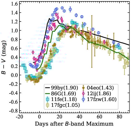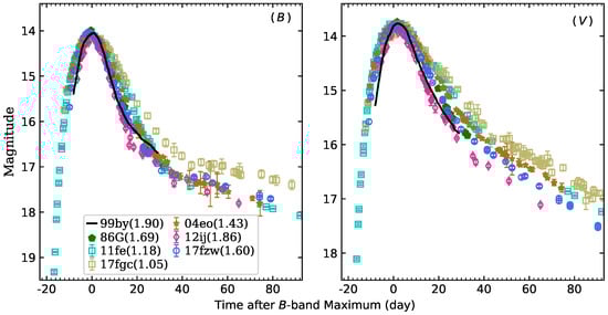 The time of first light (FLT) was estimated as MJD 57,972.00 ± 0.24 by fitting the early multi-band light curves of SN 2017fzw during the ∼7 days before the B-band maximum with the ideal expanding fireball model [], as shown in the right panel of Figure 3. Thus, its rise time is given as  days, which is comparable to the average value of normal SNe Ia (i.e., 16.0 days []) and also close to the upper limit value of 91bg-like SNe Ia (∼13–15 days []). The basic photometric parameters of this SN are listed in Table 1, which are consistent with results of Graham et al. (2022) [] within the uncertainties. For the following discussions, the phases are all given in reference to the B-band maximum of SN 2017fzw.