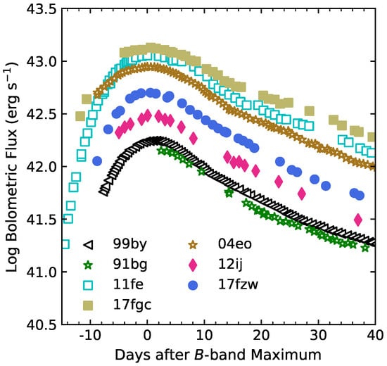 - Hoeflich, P.; Hsiao, E.Y.; Ashall, C.; Burns, C.R.; Diamond, T.R.; Phillips, M.M.; Sand, D.; Stritzinger, M.D.; Suntzeff, N.; Contreras, C.; et al. Light and Color Curve Properties of Type Ia Supernovae: Theory Versus Observations. Astrophys. J. 2017, 846, 58. [Google Scholar] [CrossRef]