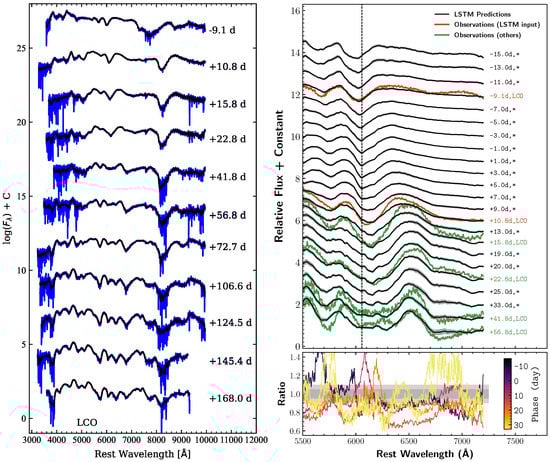 Left panel: observed (blue curves) and smoothed (black curves) spectra of SN 2017fzw obtained from LCO. The corresponding phases relative to its B-band maximum of this SN are marked on the right side. Right top panel: spectral sequence predicted from two spectra with phase difference ( days) using long short-term memory (LSTM) neural networks [] for SN 2017fzw. The predictive mean spectra are marked by solid black curves, the symbol * represents data predicted by deep learning, and their 2 standard deviations are indicated by the gray shaded areas. The corresponding observed spectra are plotted as green curves, except for the two input spectra in red. The vertical dashed line indicates the Si ii  absorption at −1.0 day. Right lower panel: flux ratios of predictions to observations for the spectral sequence. All spectra have been vertically shifted for better display.