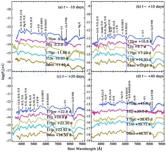 - Blondin, S.; Matheson, T.; Kirshner, R.P.; Mandel, K.S.; Berlind, P.; Calkins, M.; Challis, P.; Garnavich, P.M.; Jha, S.W.; Modjaz, M.; et al. The Spectroscopic Diversity of Type Ia Supernovae. Astron. J. 2012, 143, 126. [Google Scholar] [CrossRef]