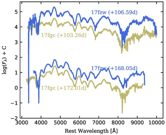 Comparison between spectra of SN 2017fzw (blue curve) and SN 2017fgc (yellow curve) at around  and  days. As in Figure 8, both spectra have been corrected for redshift and reddening.