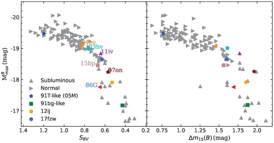 Figure 10 displays a comparison between  ( mag) of SN 2017fzw and color stretch factor (, left panel) as well as  (, right panel), utilizing data from Krisciunas et al. (2017) [] and Li et al. (2022) [], encompassing overluminous SNe Ia, subluminous SNe Ia, transitional SNe Ia, and normal SNe Ia. It is evident that SN 2017fzw, along with several other SNe categorized as normal or subluminous, is located between the majority of the normal SNe Ia (right-pointing triangles) and the 91bg-like SN Ia (green square). This supports the hypothesis of a continuous distribution of SNe ranging from normal (≤∼0.5) to 91bg-like (≥∼0.8) []. This hypothesis implies that normal and 91bg-like SNe Ia may not originate from two entirely distinct populations.