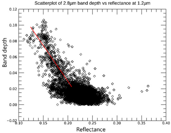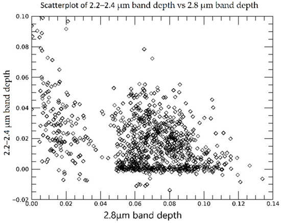 If the 2.2–2.4 µm band had been due to hydroxyl absorption, a linear dependence was expected in the scatterplot of the 2.2–2.4 µm band depth vs. the 2.8 µm band depth. This trend was not observed (Figure 12).