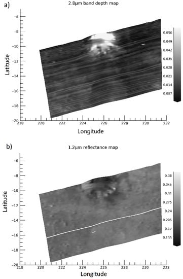 (a) Map of 2.8 µm band depth values. (b) Map of 1.2 µm reflectance values.