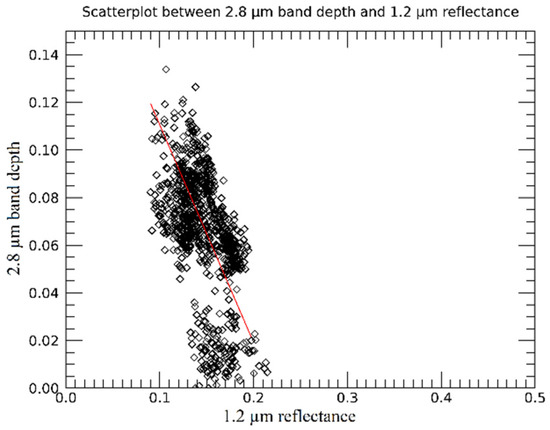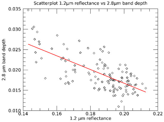 Vesta’s surface is not homogeneous in reflectance; it presents some dark areas that are listed in a catalog from Palomba et al. (2014). Dark and very dark areas on Vesta are regions where the reflectance is at least, respectively, 15% and 30% lower than the surroundings [18]. In Figure 6, the scatterplot of a single datacube containing a very dark unit is shown, chosen from those in the catalog from Palomba et al., 2014, in which the anti-correlation between the 2.8 µm band depth and the photometrically corrected reflectance at 1.2 µm is confirmed, as showed by De Sanctis et al. (2012) with the VIR data of the previous calibration.