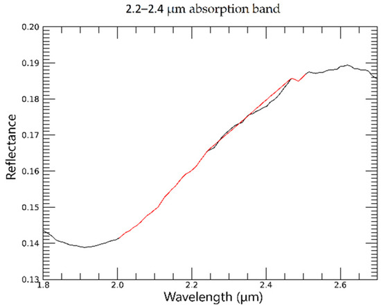 In order to verify the nature of this band (real absorption or spectral artifact), a procedure to estimate its depth was defined. Since the band is faint, the shoulders were defined as the value of the reflectance at 2.25 and 2.45 µm, respectively, and the line linking them was used as a continuum (Figure 11).